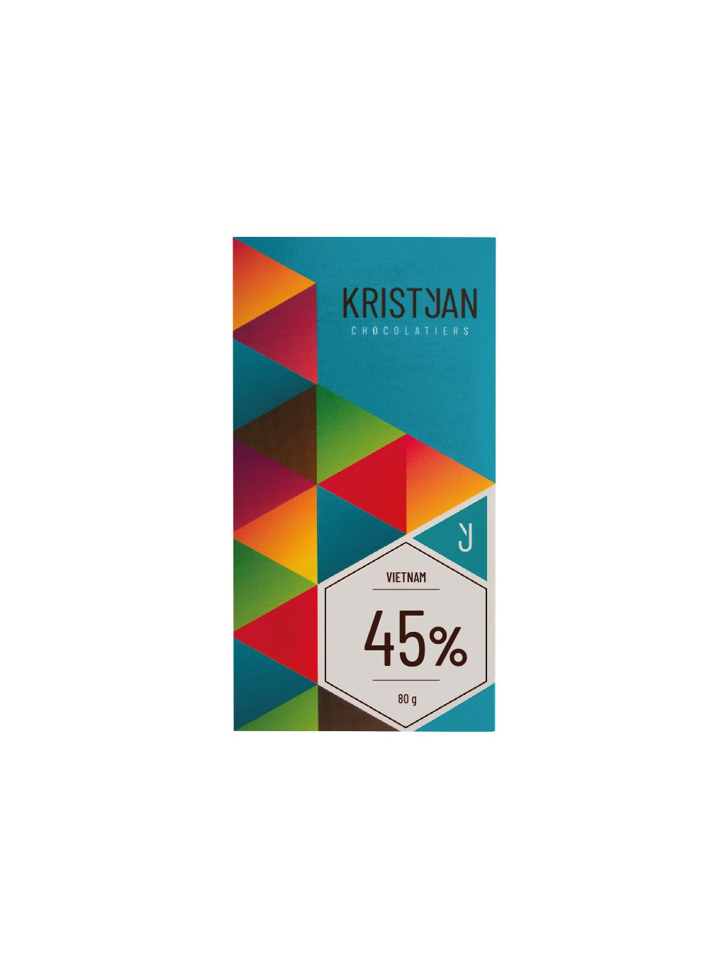 Mléčná čokoláda s obsahem kakaa 45%, vyrobená z vietnamských kakaových bobů odrůdy Trinitario. Spojuje jemnou mléčnou krémovost s příjemně ovocnými tóny, příchutí karamelu a moka, unikátní chuťový profil překvapí svěžestí a hloubkou. Neobsahuje lecitin.