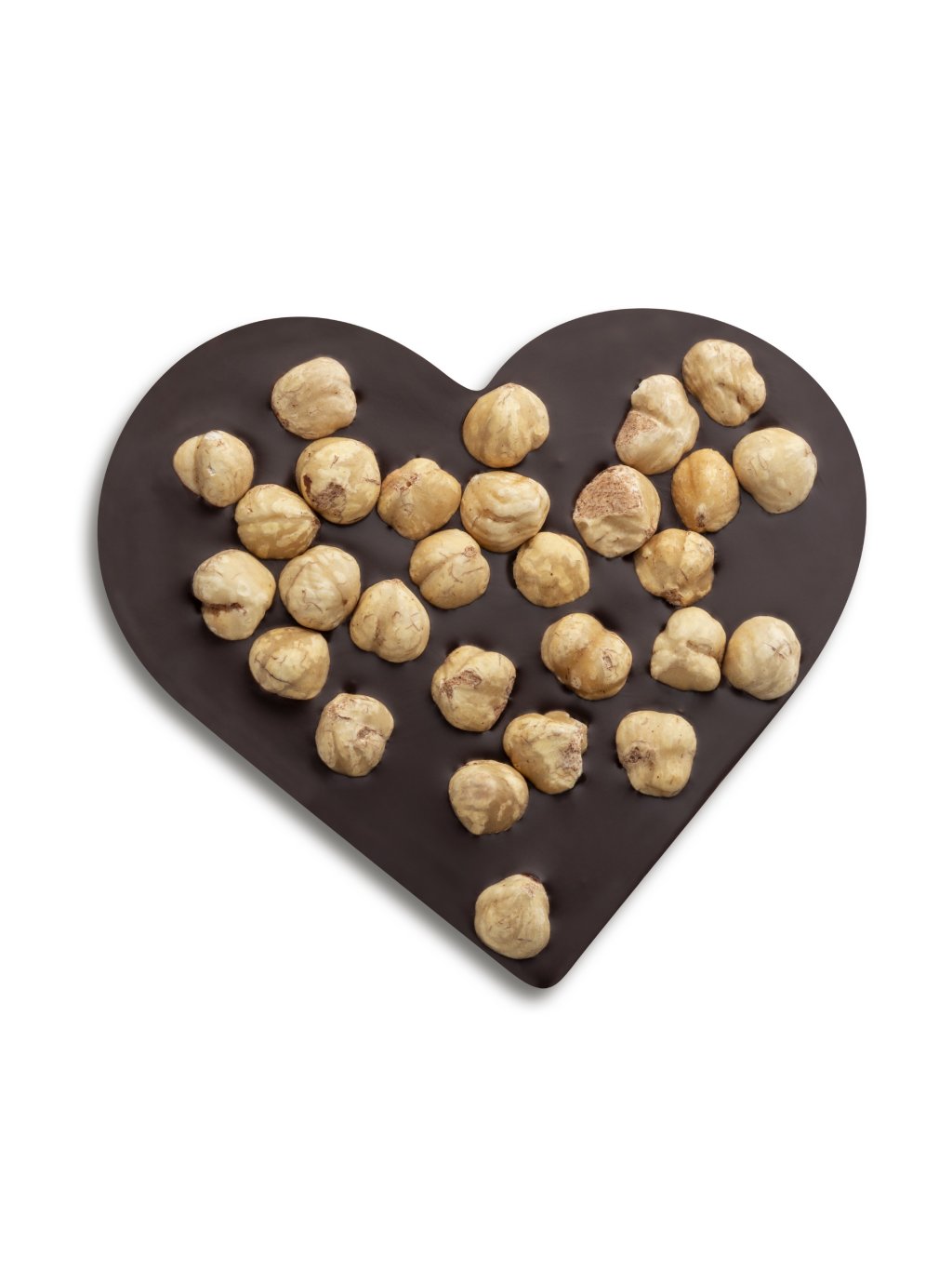 Ručně vyráběné čokoládové srdce z hořké 60%, čokolády, zdobené celými lískovými oříšky z Piemonte. Spojení kvalitní čokolády a prémiových oříšků vytváří elegantní dárek s výraznou chutí a čistým designem.