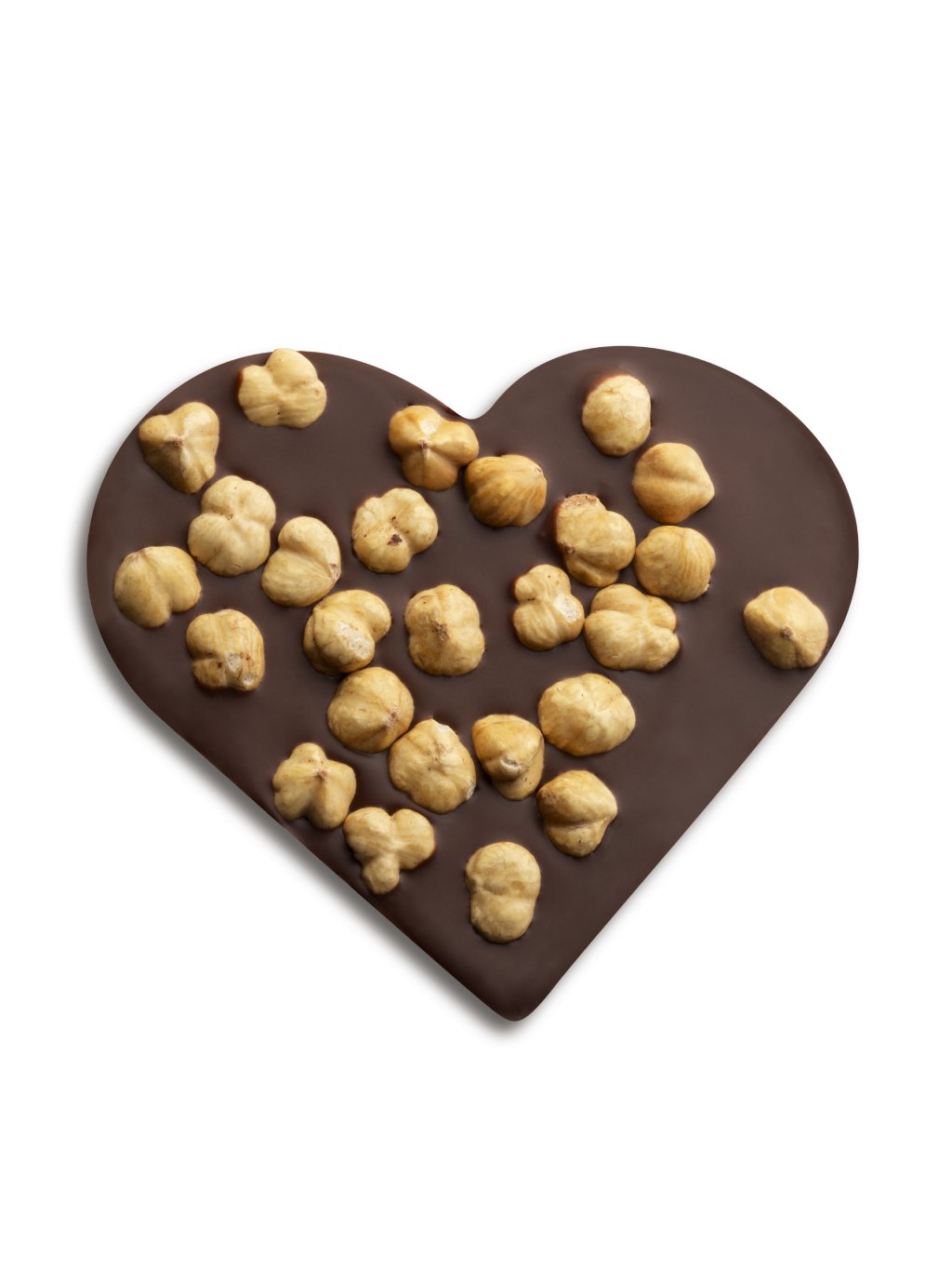 Ručně vyráběné čokoládové srdce z mléčné 41%, čokolády, zdobené celými lískovými oříšky z Piemonte. Spojení kvalitní čokolády a prémiových oříšků vytváří elegantní dárek s výraznou chutí a čistým designem.