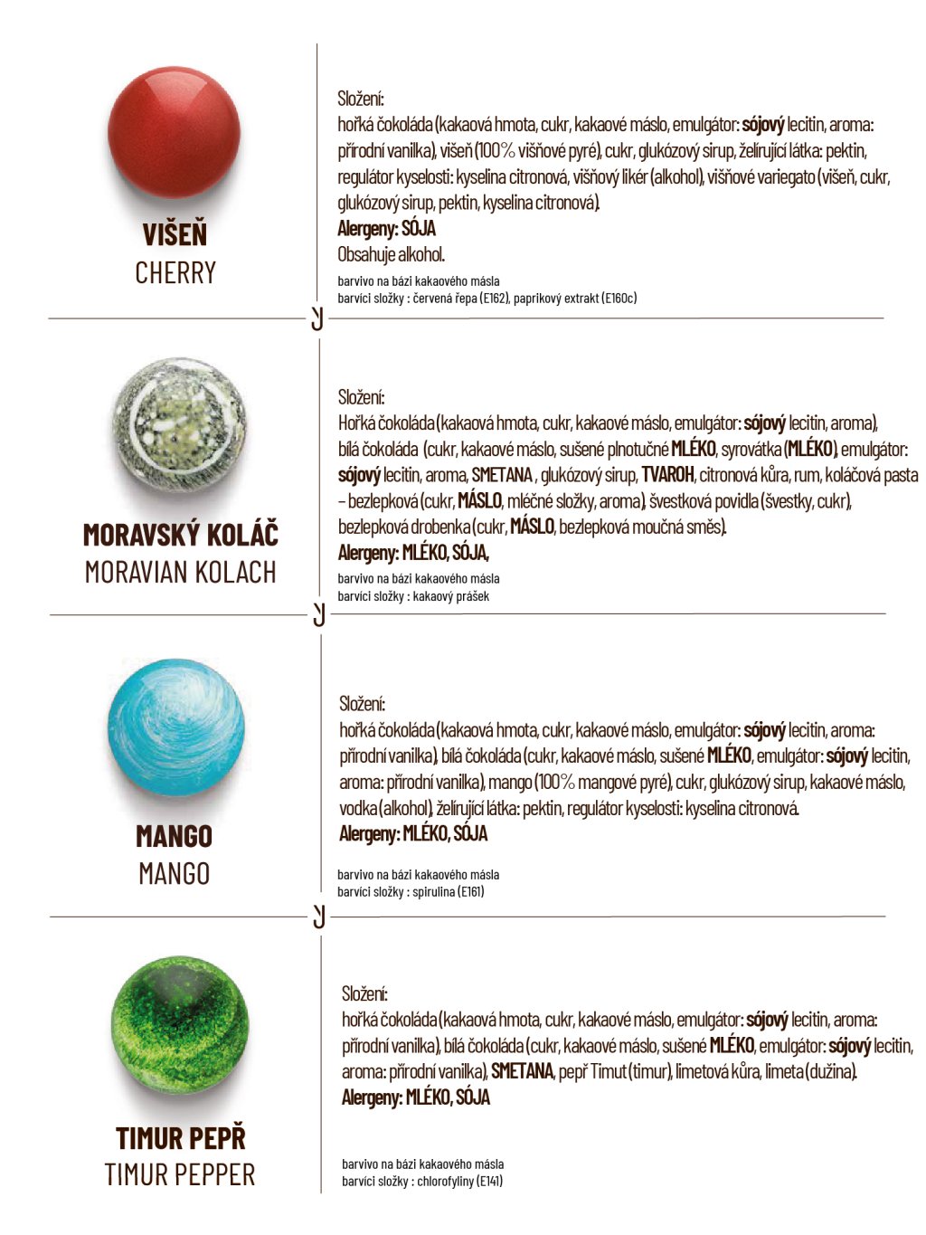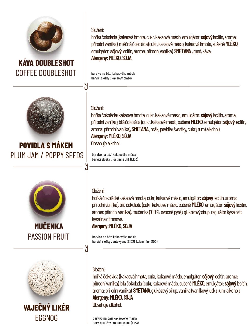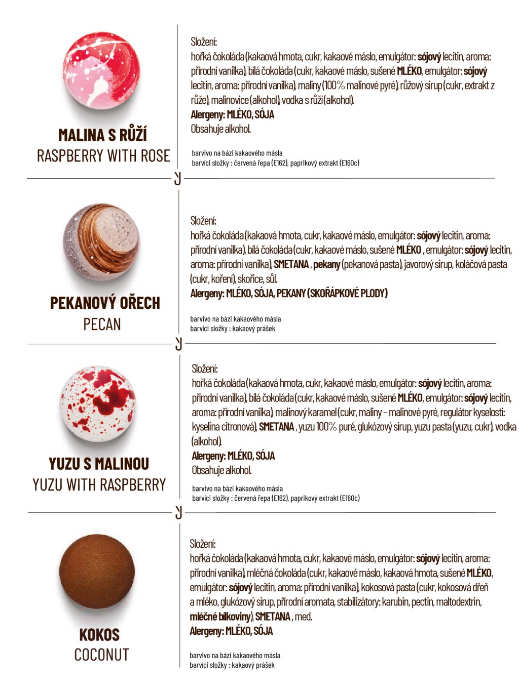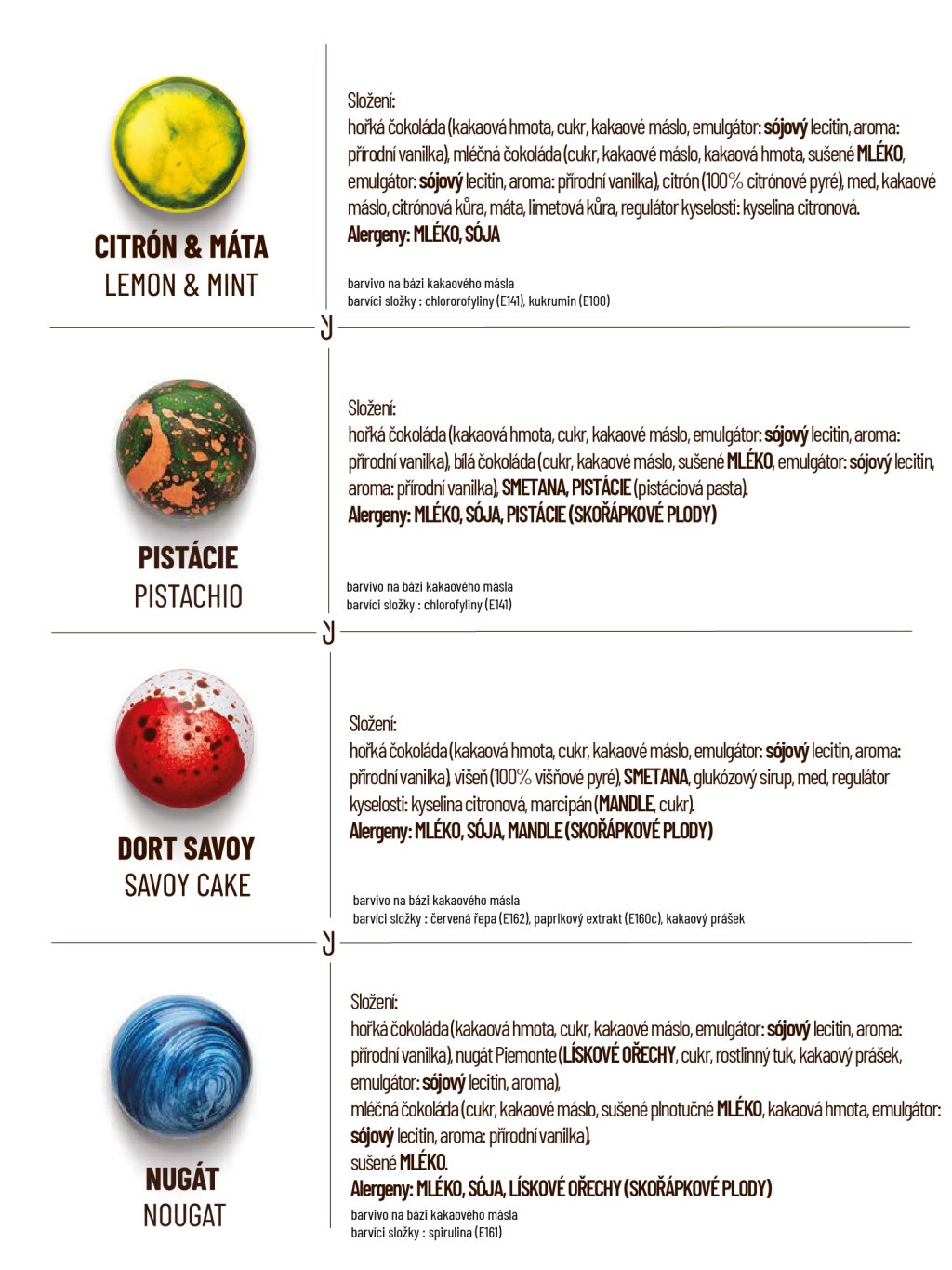 hořká čokoláda (kakaová hmota min. 60%, cukr, kakaové máslo, emulgátor: sojový lecitin, vanilka, mléčná čokoláda (kakaová hmota min. 41%, kakaové máslo, cukr, sušené mléko, emulgátor: sojový lecitin, vanilka, bílá čokoláda (kakaová složka min 32%, cukr, sušené mléko, emulgátor: sojový lecitin, vanilka. Smetana, máslo, cukr, glukózový sirup, kakaové máslo, kakaová hmota z celého kakaového plodu, med, povidla (švestky, cukr), ovocné složky v různém poměru (maliny, višně, mango, mučenka, citron, limeta, yuzu), ořechy a semena v různém poměru (pistácie, pekanové ořechy, mandle, mák), marcipán (mandle, cukr), kokos, javorový sirup, karamel, slaný karamel, káva, vanilka, vanilkový lusk, koření a byliny (máta, skořice, timur pepř), želírující látka: pektin, regulátor kyselosti: kyselina citronová, aromata, alkohol v různém množství (rum, višňovka, kávový likér, Kahlúa , vodka).