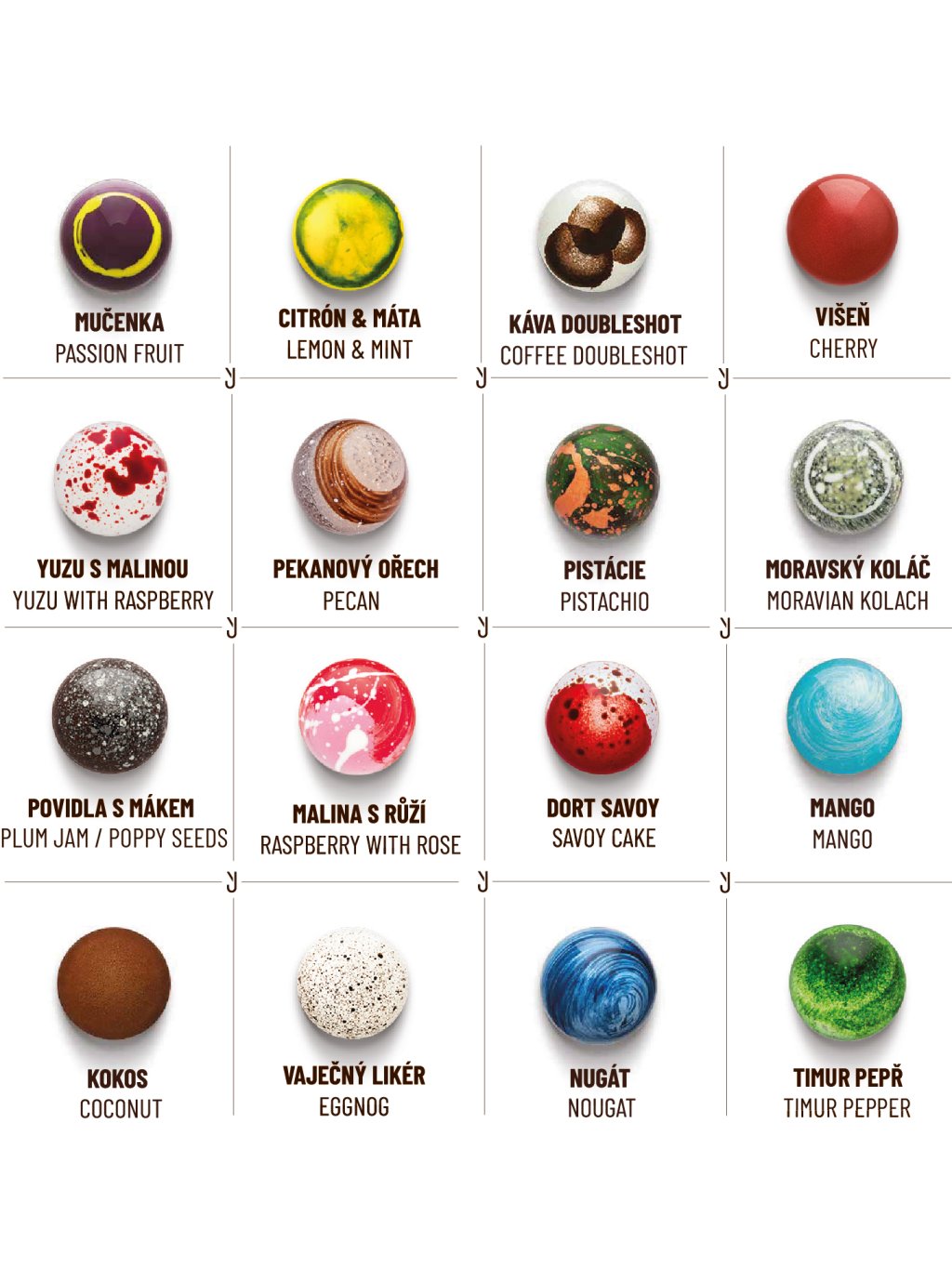 V kolekci najdete následující pralinky: Mučenka, Citrón & máta, Višeň, Káva Doubleshot, Yuzu s malinou, Pekanový ořech, Pistácie, Moravský koláč, Povidla s mákem, Mango, Nugát, Timur pepř, Vaječný likér, Kokos, Malina s růží, Dort Savoy.