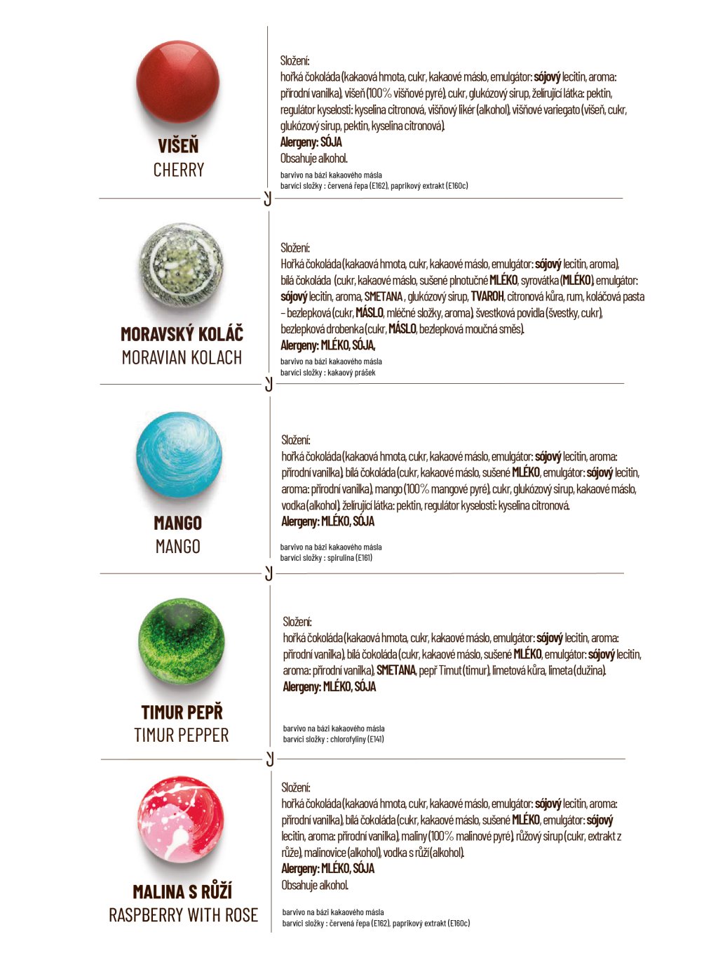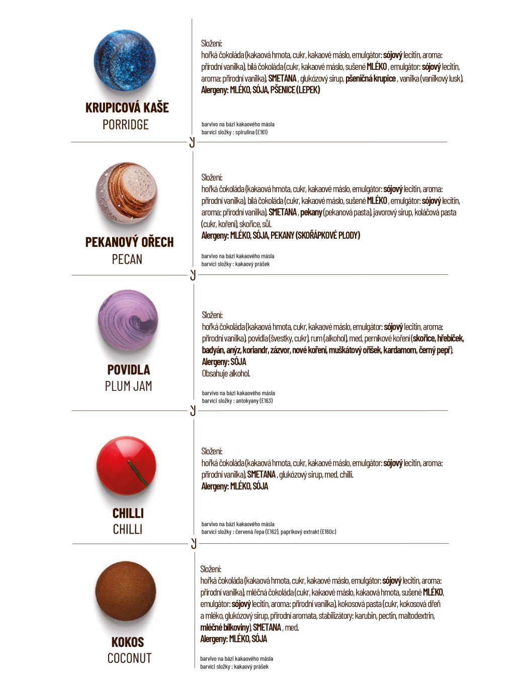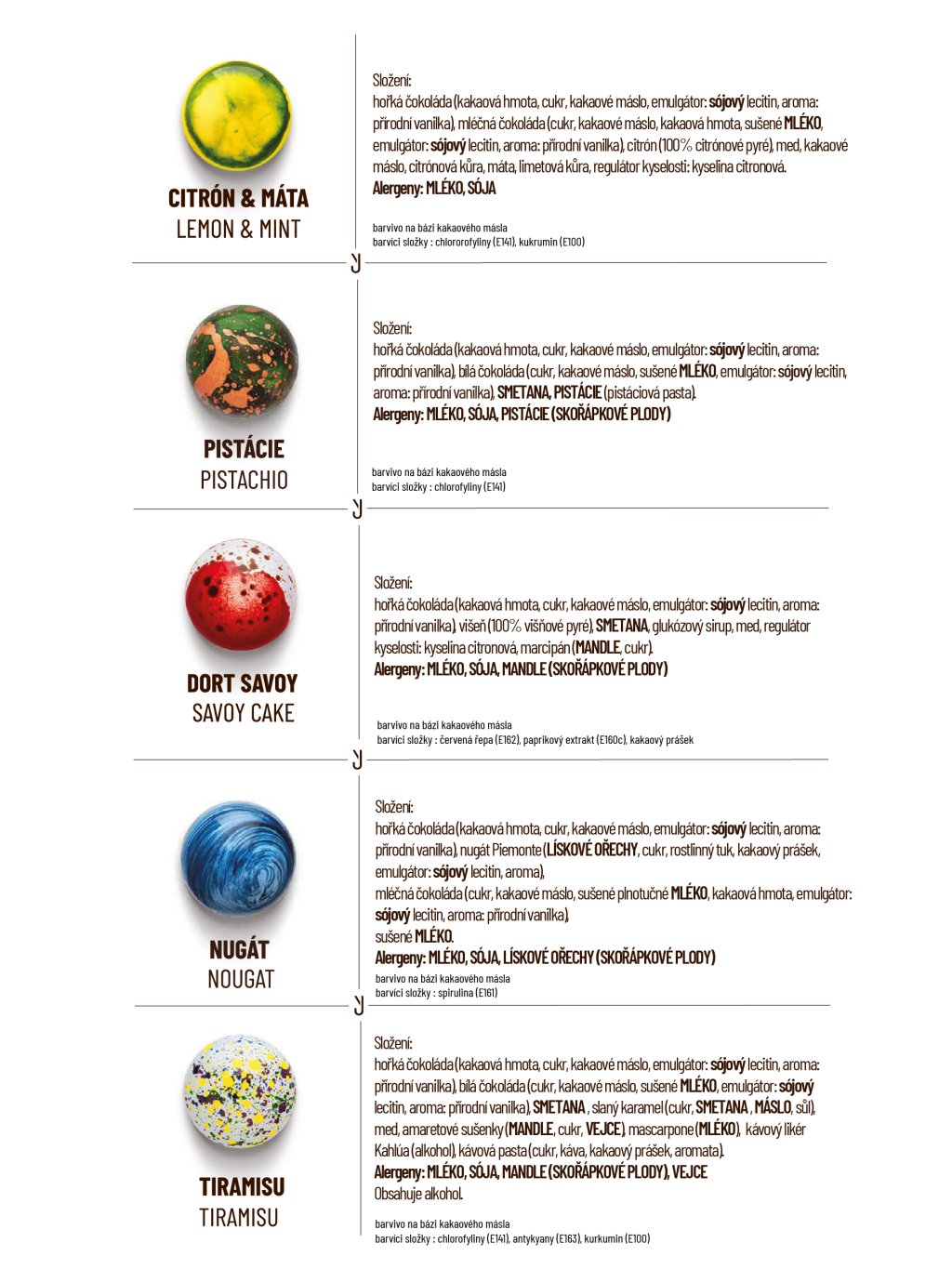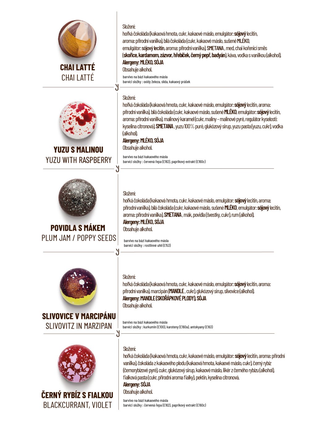 Hořká čokoláda: kakaová hmota min. 60%, cukr, kakaové máslo, emulgátor: sojový lecitin, vanilka. Mléčná čokoláda: kakaová hmota min 41%, cukr, kakaové máslo, sušené mléko, emulgátor: sojový lecitin, vanilka. Bílá čokoláda: kakaová složka min. 32%, cukr, sušené mléko, emulgátor: sojový lecitin, vanilka. Smetana, máslo, cukr, glukózový sirup, kakaové máslo, kakaová hmota z celého kakaového plodu, med, povidla (švestky, cukr), ovocné složky v různém poměru (maliny, višně, černý rybíz, mango, mučenka, citron, limeta, yuzu, lesní ovoce), ořechy a semena v různém poměru (pistácie, pekanové ořechy, mandle, arašídy, mák), marcipán (mandle, cukr), kokos, javorový sirup, karamel, slaný karamel, sušenky amaretti (cukr, mandle, vejce, pšeničná mouka), sušené mascarpone (mléko), káva, vanilka, vanilkový lusk, koření a byliny (máta, perníkové koření, chai koření – skořice, kardamom, zázvor, hřebíček, černý pepř, timur pepř), želírující látka: pektin, regulátor kyselosti: kyselina citronová, aromata, alkohol v různém množství (rum, višňovka, kávový likér, cassis, Kahlúa, vodka).