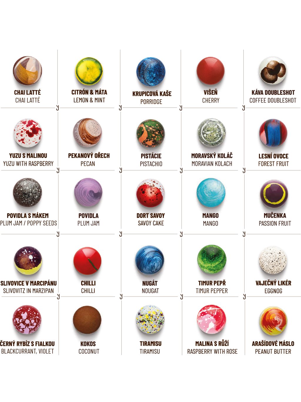 V kolekci najdete následující pralinky: Chai latté, Citrón & máta, Krupicová kaše, Višeň, Káva Doubleshot, Yuzu s malinou, Pekanový ořech, Pistácie, Moravský koláč, Lesní ovoce, Povidla s mákem, Mango, Mučenka, Slivovice v marcipánu, Chilli, Nugát, Timur pepř, Vaječný likér, Černý rybíz s fialkou, Kokos, Tiramisu, Malina s růží, Arašídové máslo, Dort Savoy a Povidla.