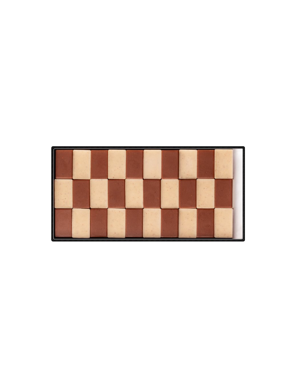 Oříšky jsou pečlivě praženy tak, aby se rozvinula jejich plná aromatika – tóny kakaa, sušenek a lehce karamelový podtón. Následně jsou zpracovány do hladkého nugátu s vysokým podílem ořechové pasty. Kolekce je komponována do šachovnicového vzoru: