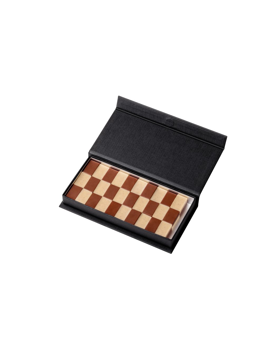 Elegantní šachovnicová kompozice lískového nugátu z pražených piemontských lískových oříšků známých svou intenzivní vůní, sladkostí a jemnou texturou.